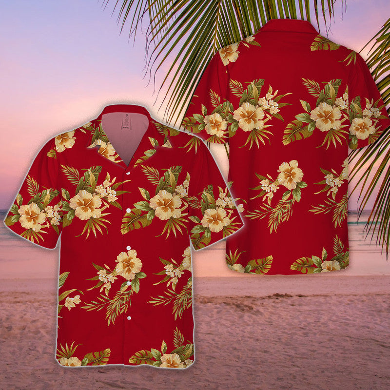 Hibiscus Hawaiian Shirt - Unisex Red Shirt with Yellow Flowers & Tropical Leaf Design
