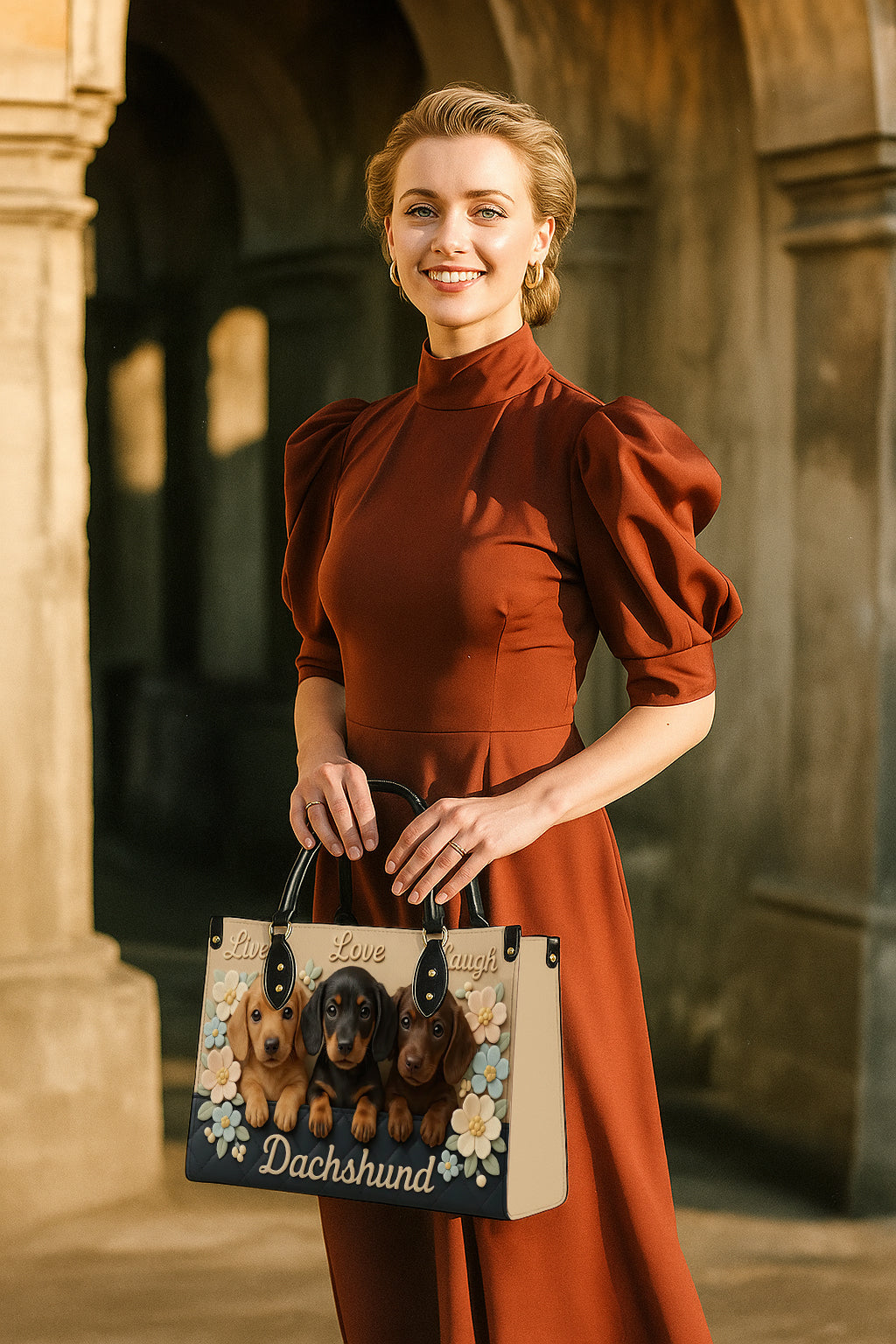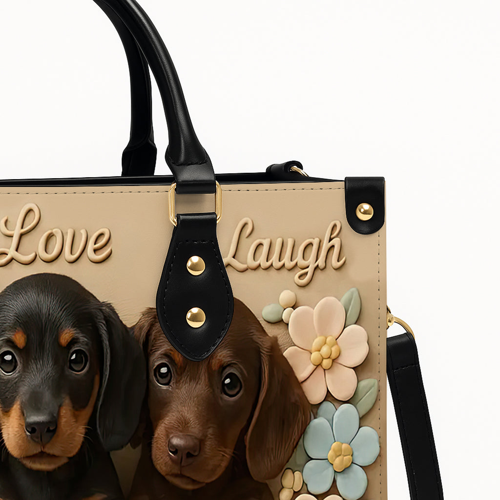 Dachshund Handbag – Live Love Laugh Tote Bag with 3D Flowers and Cute Dachshund Puppies